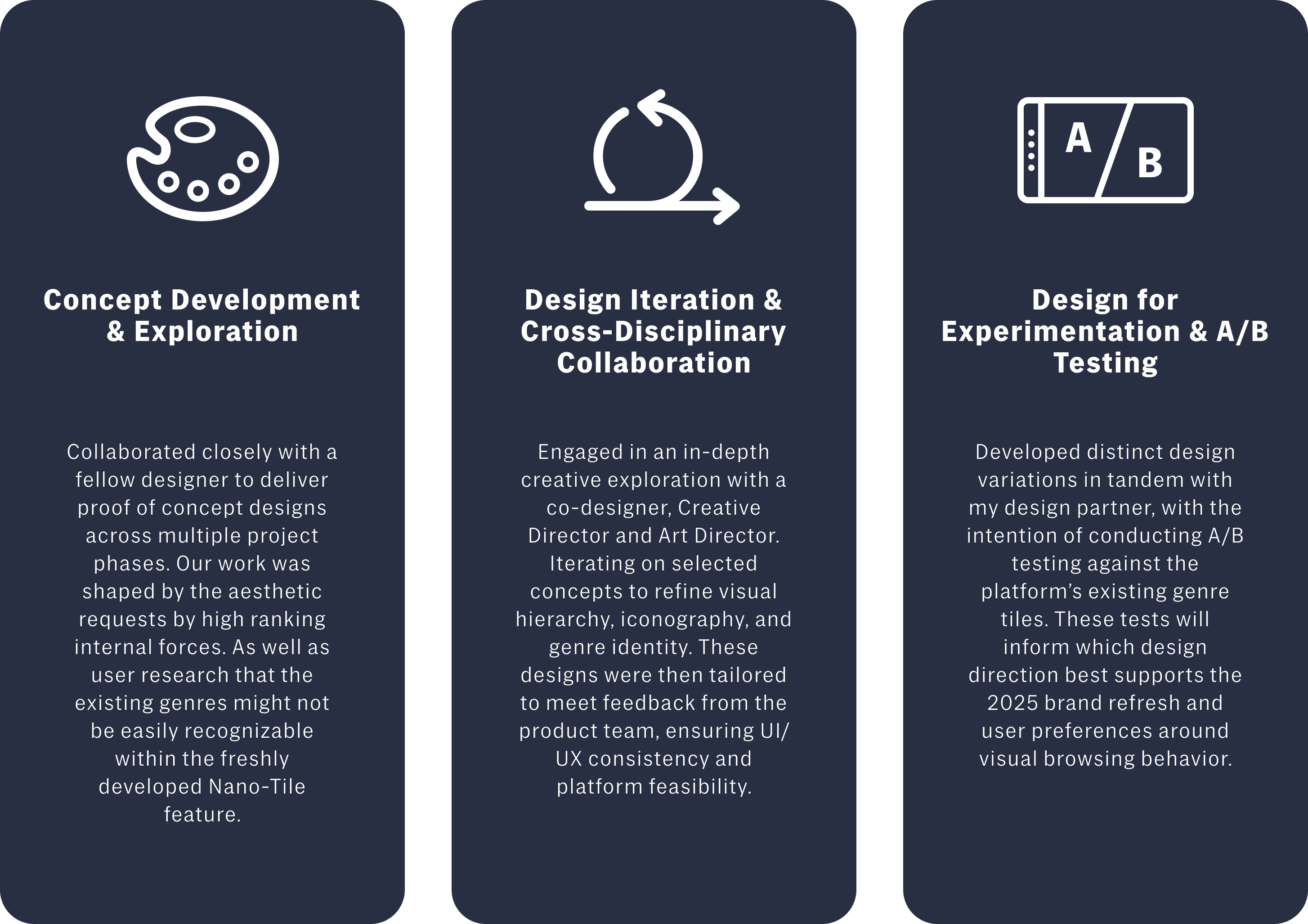 Don’t worry, I won’t walk you through every single idea I came up with. But I will show how our priorities shifted over time and how those changes shaped the final outcome. The scope grew each sprint: we started by designing six genre tiles, and eventually expanded to include page headers as well.