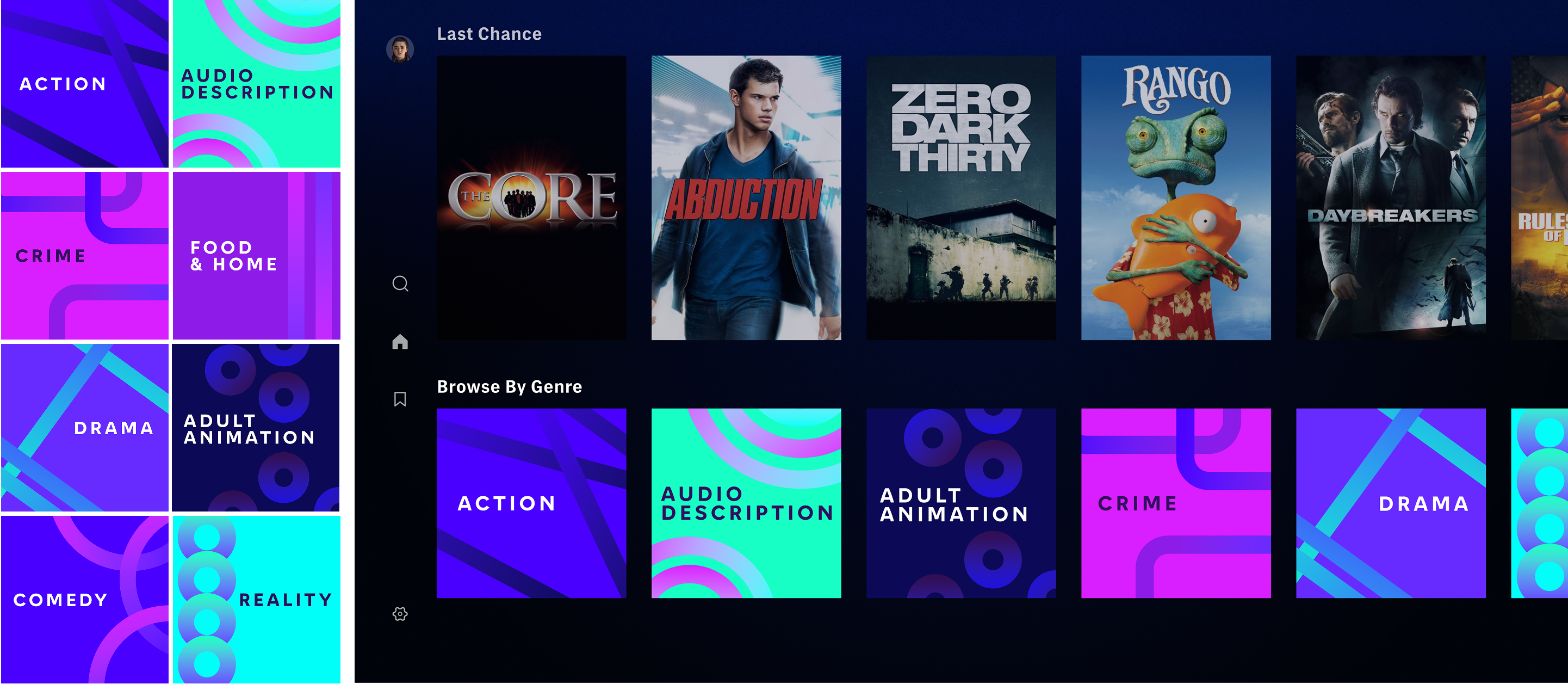 The first six genres we tackled were: Action, Adult Animation, Crime, Drama, Food & Home, Reality, Comedy, and Audio Description. Our Creative Director and Art Director prioritized these because they offered a balanced range of difficulty. Their experience from a prior year’s sprint taught them that if a design could handle the complexities of Comedy, Audio Description, and Action, it could likely scale across the full suite. That made my job particularly tough at the beginning—but once a final direction was chosen, everything clicked into place.